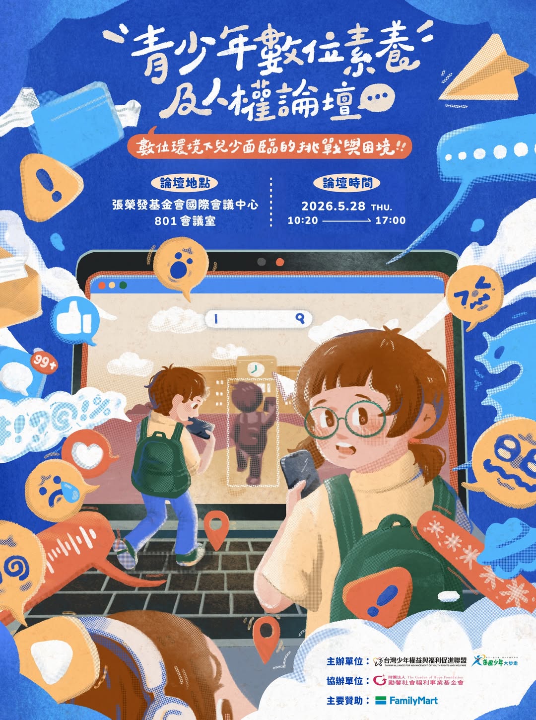 聯合國《兒童權利公約》第25號一般性意見書中指出,締約國應確保兒童與青少年之權利在數位環境中同樣受到尊重、保護與實現,而台灣在2014年通過施行《兒童權利公約施行法》,並於2017年完成首次國家報告國際審查,展現政府落實兒少權利保障的制度承諾。但數位環境快速變遷,網路平台與社群媒體高度發展的現在,兒少性剝削、網路性暴力、仇恨性言論與不當內容擴散等問題,成為現行制度的巨大挑戰。本次論壇希望自學界、政府、企業、及青少年自身觀點出發,一同討論當代數位使用中,兒少所遇議題,並激發更多解決的可能性。